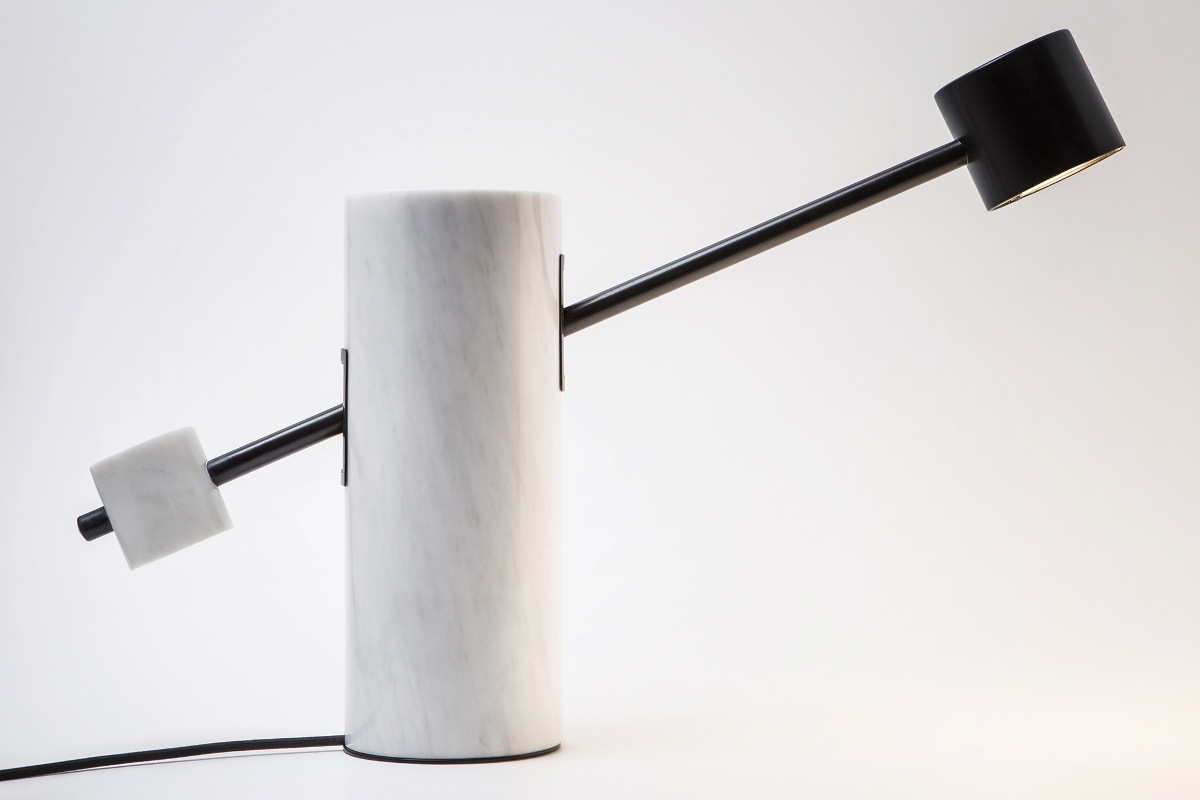 Χρησιμοποιώντας την αρχή του μοχλού, η BOWING LAMP, συνδυάζει το μάρμαρο Achilles με μεταλλική ανοξείδωτη κατασκευή βαμμένη σε μαύρο χρώμα. Μεταλλικός άξονας διαπερνά το μασίφ μαρμάρινο κύλινδρο. Τοποθετημένα αντιδιαμετρικά στον άξονα, υπάρχουν φωτεινή πηγή και μαρμάρινο βαρίδι. Η συνδεσμολογία στο εσωτερικό του μαρμάρου επιτρέπει στον άξονα να μετακινεί καθ’ ύψος τη φωτεινή πηγή που βρίσκεται στο άκρο του.