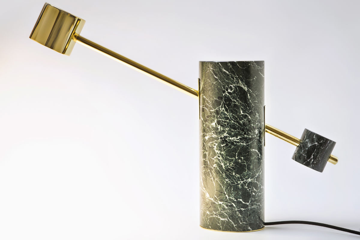 Χρησιμοποιώντας την αρχή του μοχλού, η BOWING LAMP, συνδυάζει το μάρμαρο της Τήνου με μεταλλική ανοξείδωτη κατασκευή η οποία έχει υποστεί επιμετάλλωση με μπρούτζο. Μεταλλικός άξονας διαπερνά το μασίφ μαρμάρινο κύλινδρο. Τοποθετημένα αντιδιαμετρικά στον άξονα, υπάρχουν φωτεινή πηγή και μαρμάρινο βαρίδι. Η συνδεσμολογία στο εσωτερικό του μαρμάρου επιτρέπει στον άξονα να μετακινεί καθ’ ύψος τη φωτεινή πηγή που βρίσκεται στο άκρο του.
